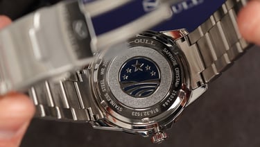 Turning the case over, and the screw-on caseback is another highlight—it’s embossed with Seagull’s “star rising from the ocean” emblem, finished with what looks like an enamel or ceramic infill that gives it real visual depth. The perimeter is engraved with all the key specs, and the overall impression is one of quality and confidence.