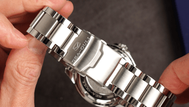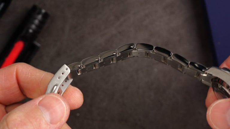 It is finished with brushed tops and polished sides that match the case finishing perfectly. The 22-millimeter lug width slightly tapers down to 20mm toward the clasp, balancing the proportions nicely.
