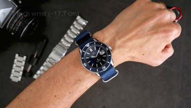 The stainless steel bracelet is quite generous and should cover wrists up to about nine inches. However, with 6 removable links - three on each side, we are somewhat limited when it comes to bracelet sizing. So, if your wrist is under six and a half inches, you might struggle to get a snug fit. One option is swapping the bracelet for the included Zulu-style nylon strap, which makes it much more manageable for slimmer wrists. Not an ideal compromise, but still workable.