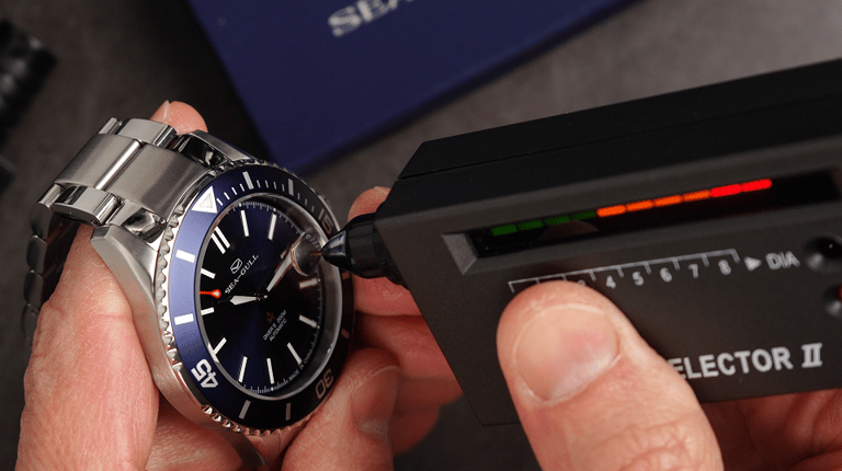 On top, we’ve got a flat sapphire crystal with anti-reflective coating that performs really well. As I always do I also checked the cyclop with my diamond tester and sure enough it is made out of Sapphire as well, which is great. The cyclop is well aligned and provides good date magnification with minimal distortion. The combination of both sapphire elements gives this watch excellent scratch resistance and a premium look