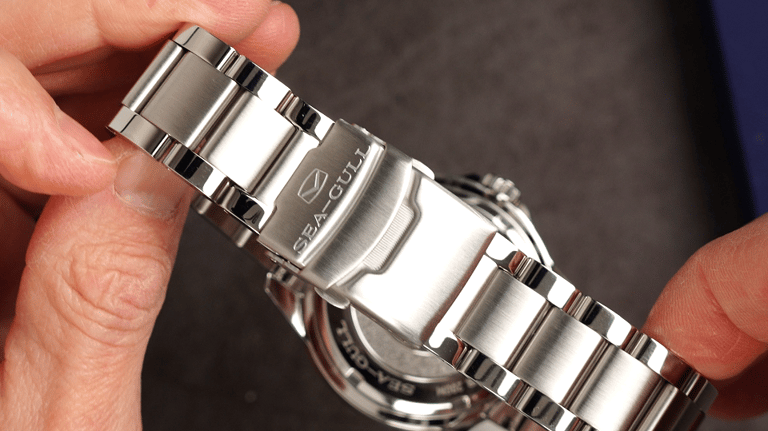 The crown guards are neatly integrated, protecting a screw-down crown that’s moderately sized but easy to operate. Threading is smooth, grip is good, and the crown is signed with Seagull’s logo.