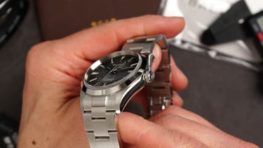 It’s a classic Oyster-style bracelet, executed well. I like the use of inverted end links. They’re solid stainless steel, neatly integrated into the case and sit slightly recessed within the lugs, which adds a level of refinement we usually don’t see on cheaper executions—and it’s something I always appreciate when brands get it right. Finishing is also very decent. The top surfaces are fully brushed, which helps hide everyday wear, while the sides are high-polished for a bit of contrast. There’s also a gentle taper, narrowing down to around 16 millimetres at the clasp, which gives this spot style design a touch of elegance. The bracelet has good flexibility and fluidity on the wrist, and the links are secured with screws, which is always a welcome.