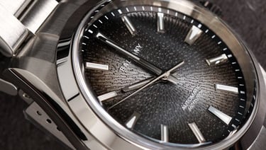 The dial surface itself is where things really come alive. That smoky, fumé finish is genuinely striking. While the pattern isn’t organically formed—this isn’t a gemstone or a naturally occurring texture—it’s very well executed. The texture draws your eye toward the centre of the dial, adds depth, and gives the watch a dynamic presence as the light shifts.