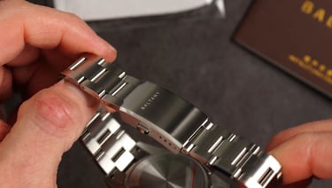 The clasp is Baltany’s familiar milled, double-pusher design, with a solid scissor-style construction. It feels robust and well made, with plenty of micro-adjustment for dialing in the fit. There’s no on-the-fly adjustment, but for a GADA watch like this, while definitely a nice to have, but generally not really an issue. Clasp finishing matches the bracelet, and it’s signed with the Baltany name.