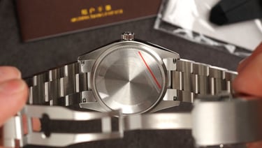 Now, flipping the watch over, and things here stay clean and understated. The screw-on caseback features circular brushing with a subtle sunburst effect.