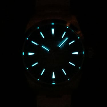 Visually, the applied hour markers immediately set the tone. There’s a clear blend of influences here, sitting neatly between Omega Aqua Terra styling and Grand Seiko restraint. The indices are clean, faceted, and catch the light nicely without feeling oversized or flashy.