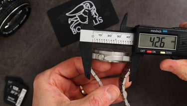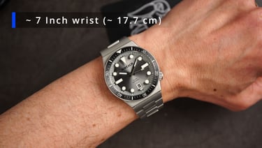 Now, on paper, that 42.5mm lug-to-lug sounds beautifully compact — and technically, that’s correct if you’re measuring the case. However, this watch uses kinda protruding inverted end links. They do curve down quite aggressively, which helps with comfort, but they have almost no articulation. So in practical terms, the effective span from end link to end link measures just over 52 millimeters. Now, that’s still very reasonable and is important in a context. The 40mm case keeps this diver in that sweet spot for most wrist sizes, while that slightly wider effective footprint gives it a bit more wrist presence, especially on larger wrists.