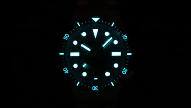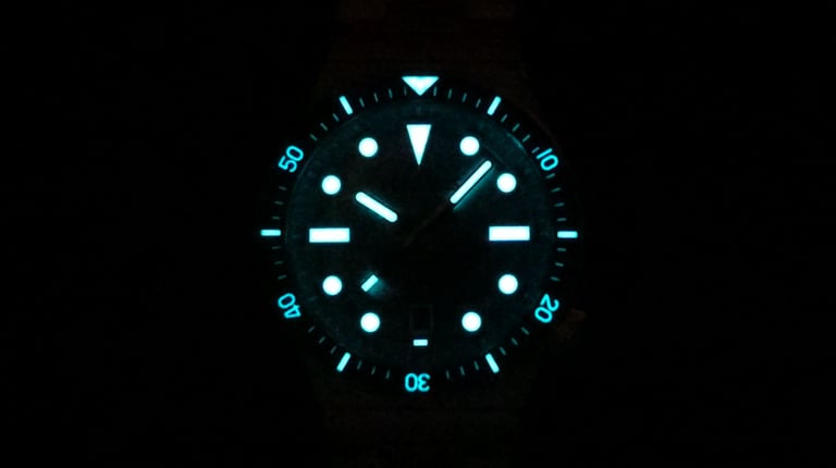 The date window sits at six o’clock, maintaining that symmetry. And importantly, Borealis kept a portion of the six o’clock marker visible and lumed, so we don’t lose the structural balance of the dial — or nighttime functionality. Now, speaking of lume… As promised - here is my 15 minute lume test and this diver does not disappoint. All hour markers are fully lumed, the handset is also generously covered with lume, and performance is strong. I won’t say it outright crushes Seiko’s best divers, but it absolutely holds its own. Bright, evenly applied, and long-lasting. We also get lume on the bezel markings and overall, nighttime legibility here is very impressive.