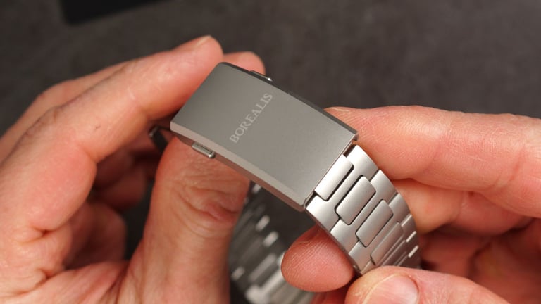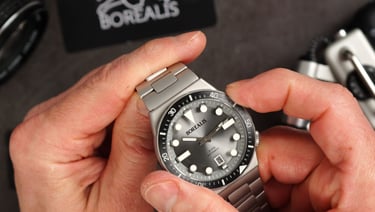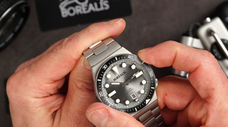 Now, here’s a detail I really appreciate. The links are secured with screws — but not the most common type. Borealis uses screws where the threading is done on the screw head side rather than relying on a more conventional approach of threading on the opposite end. This is actually my preferred setup, and something we’ve seen on some higher-end pieces as well. What that does is makes the screw less likely to get undone and reduces the risk of over-tightening the link. So it is generally a more robust, more confidence-inspiring system compared to the more conventional designs where the thread sits on the opposite side.