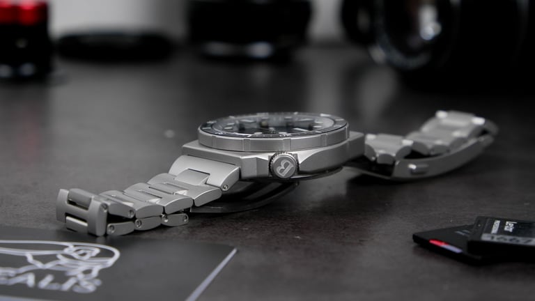 The bezel grip follows the same aesthetic language as the rest of the watch. It’s sandblasted, slightly unconventional in shape, and integrates nicely into the overall tool-like design. It’s not aggressively sharp, but it’s absolutely functional and easy to operate. In terms of bezel action — I’d call it good, but not class-leading.