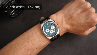 The proportions here are compact, but the integrated lugs and fixed end links give it a broader wrist presence than you’d expect from the diameter alone. It’s an interesting blend—smaller case, but visually it still carries some heft.