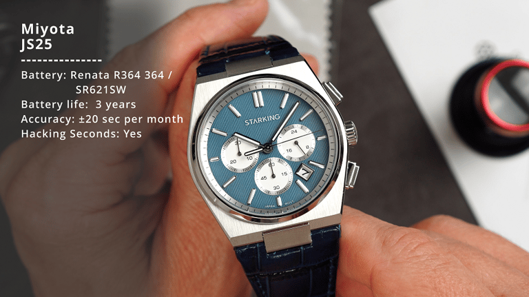 Inside, we’ve got the Miyota JS25 quartz chronograph movement. It’s Japanese-made, reliable, and accurate. But the layout may divide opinions.