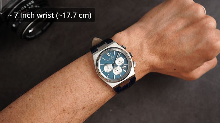 That said, the effective lug-to-lug of 50.5 millimeters and square form factor does make the watch wear larger than its 41mm diameter suggests. However the thin case profile partly makes up for that. On my seven-inch wrist, it’s fine, but if you have a wrist, say slimmer than 6.5 inches, you might notice the broad stance from those fixed end links.