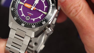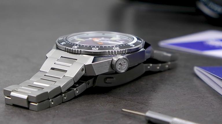 The screw-down crown at 3 o’clock is slightly recessed into the case. There are no crown guards, but that shallow recess offers a touch of protection while keeping the silhouette clean. The threading feels secure and refined, working together with the screw-on caseback to achieve the 300-meter water resistance.