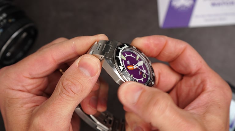 The clasp is very good - a double-pusher milled clasp with a built-in on-the-fly adjustment mechanism, allowing easy fine-tuning without tools. It’s solidly built, practical, and neatly signed with the engraved Phoibos logo.