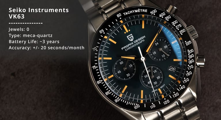 Right, so in terms of the movement that we’ve got here — it’s the VK63. If you've been watching my channel for a while you’re probably very familiar with this one. It's a Japanese calibre made by Seiko, and its claim to fame is that it’s a mecha-quartz — a combination of a quartz base with a mechanical chronograph module on top.
