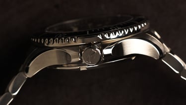 Up top, we’ve got clean brushing across the lugs and case surfaces, while a crisp, high-polished chamfer runs along the edges, catching the light nicely and adding a bit of refinement to what is otherwise a serious tool-watch design. The brushing continues along the flanks as well, and overall the finishing quality here feels very solid.