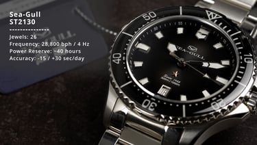 Inside, we’ve got the Sea-Gull ST2130 — a fully in-house automatic movement and one that’s very well regarded among enthusiasts. In terms of architecture, the ST2130 is based on the Swiss ETA 2824-2 layout, which puts it in the same family as movements like the Swiss Sellita SW200 and the PT5000 from Hong Kong Precision Technologies.