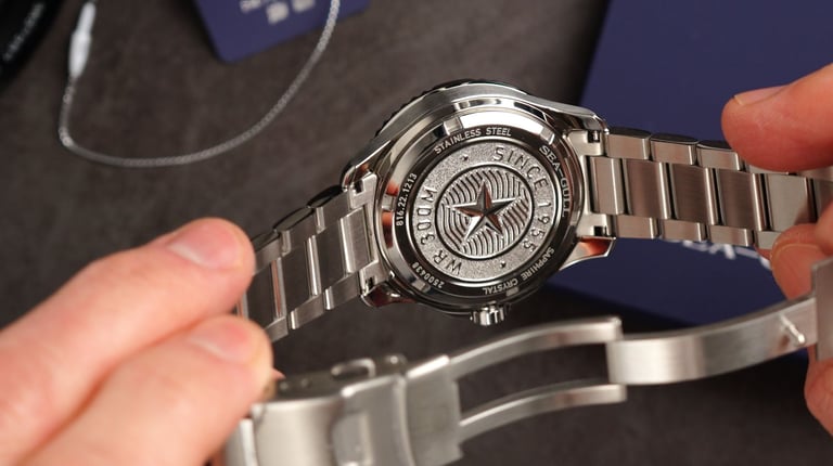 Flip the watch over, and we’ve got a polished back of the case with a screw-on caseback which features a bold embossed Sea-Gull star medallion at the center with a not so subtle reminder that they have been around since 1955and this piece is capable of withstanding 300m of water resistance. Surrounding it are engraved specifications, model details, and an individual serial number — a nice reminder that this is a full production piece from a major manufacturer rather than a small-batch microbrand.