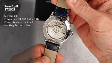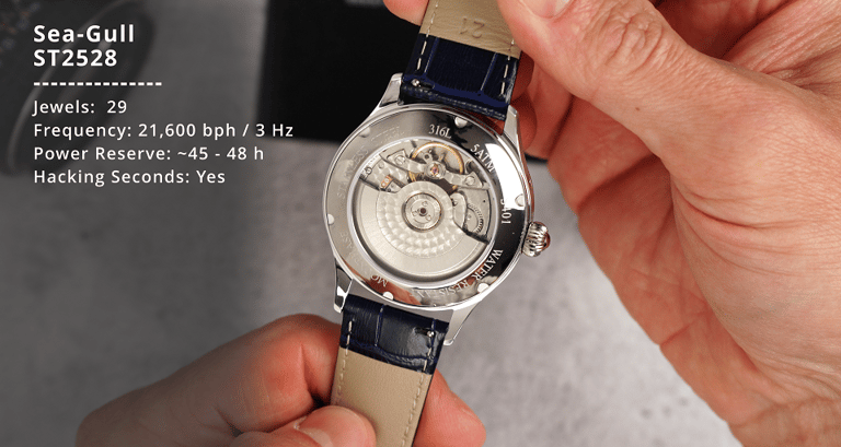 Now let's talk about what’s ticking inside. This is the Seagull ST2528, and it’s not your everyday movement. We’ve got 29 jewels here supporting that moonphase and big date complication. It’s hackable, hand-windable, and offers a bit of extra practicality with around 45 to 48 hours of power reserve. So you’re getting a bit more stamina than your typical 40-hour standard.