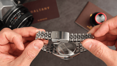 The crown is screw-down, signed, and proportioned well. Operation is smooth, threading is clean, and together with the solid screw-down caseback, the watch achieves that reassuring 100 meters of water resistance. Flip it over and we’ll find that the caseback is completely sterile — no logos, no engraving, just a clean brushed finish. Very much in keeping with the Rolex inspiration, and perfectly fine on a watch like this.