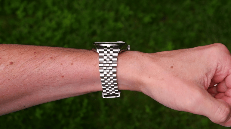 The fluted bezel is of course the star here — crisp, reflective, and unapologetically flashy. This isn’t a watch that tries to hide in the background. And the bezel is complemented nicely by the curved high polished flanks, giving it a very dressy appearance.
