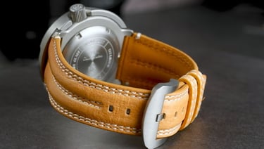 The material and colour pairing also work very well. The matte grey titanium keeps things understated, while the warm beige leather strap adds contrast without breaking the aesthetic. The strap is well padded near the case and flares to meet the sides of the shroud, creating an almost integrated look while still using standard 22-millimetre lugs.