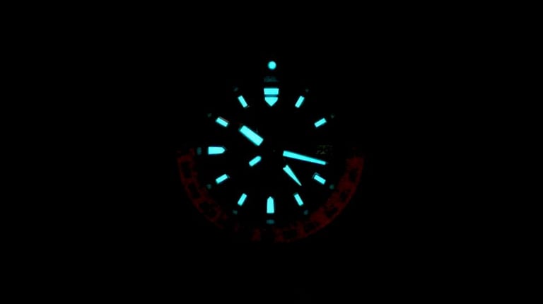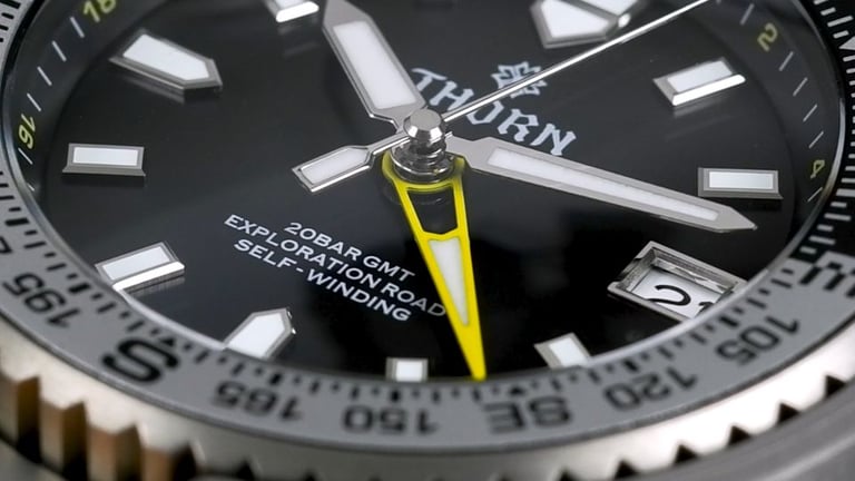 Then we come to the dial and handset — easily one of the highlights. THORN didn’t borrow anyone else’s language here; the hands are clean, distinctive, and very well proportioned, and the applied markers are crisp and neatly framed. The GMT hand pops just enough to stay functional without making the watch feel flashy. And importantly, THORN didn’t cut corners with the lume either. As we’ll see just now in my usual 15-minute lume test.