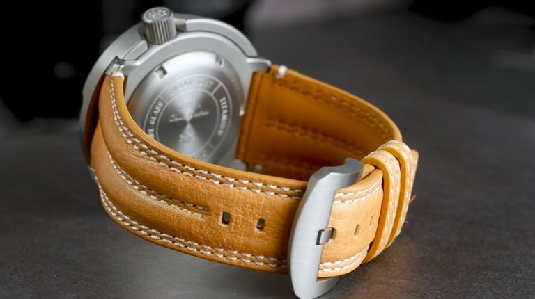 The strap is one of the visual highlights of this watch. According to the listings the top layer is genuine cowhide leather and it both looks and feels excellent. It’s softer and more pliable than expected, requires almost no break-in, and the padded, slightly flared shape gives the watch an almost integrated look. It is double sided - The underside is smooth and comfortable, the top has a nice subtle structured kinda slightly textured finish, and overall it suits the titanium case very well.